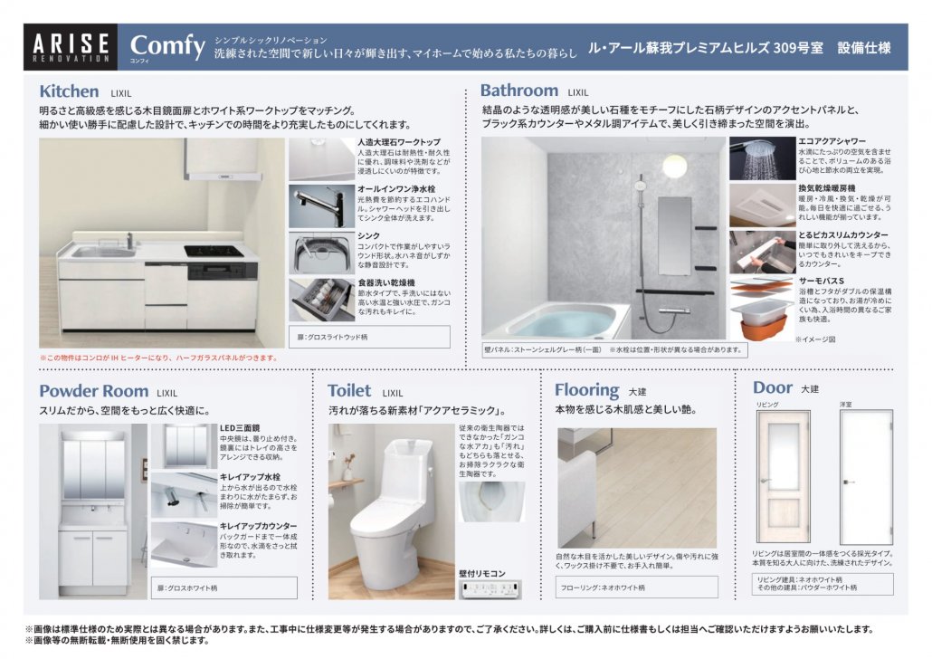 | 設備 | キッチン交換/浴室交換/洗面交換/トイレ交換/ 水まわり床張替/フローリング新規(張替)/建具交換/ 照明交換/給湯管更新/電気温水器(追焚機能)交換/ 下足入/全クロス貼替/アクセントクロス | ||