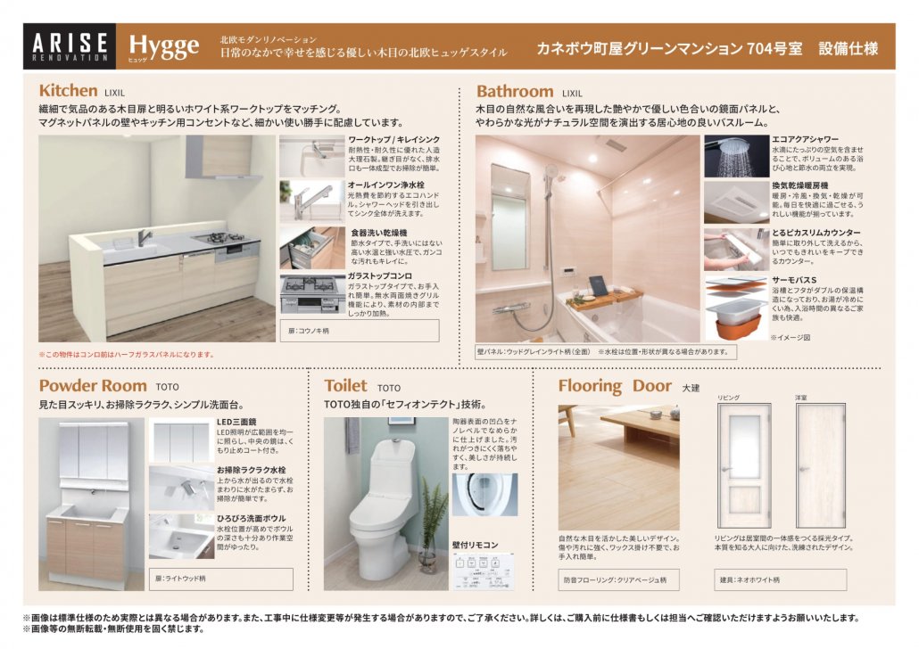 | 設備 | キッチン交換/浴室交換/洗面交換/トイレ交換/ 水まわり床張替/フローリング新規(張替)/建具交換/ 照明交換/給水・給湯管更新/給湯器(追焚機能)交換/ 下足入/全クロス貼替/アクセントクロス | ||