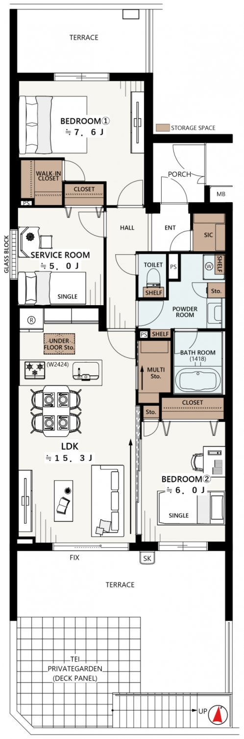 | 専有面積 | 80.73㎡ | バルコニー面積 | 24.50㎡ (テラス) |