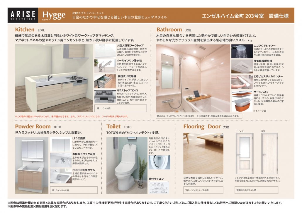 | 設備 | キッチン交換/浴室交換/洗面交換/トイレ交換/ 水まわり床張替/フローリング新規(張替)/建具交換/ 照明交換/給水・給湯管更新/給湯器(追焚機能)交換/ 下足入/全クロス貼替/アクセントクロス | ||