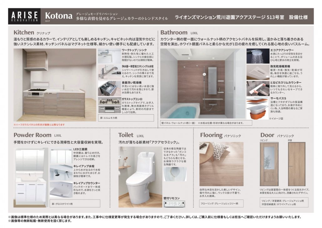 | 設備 | キッチン交換/浴室交換/洗面交換/トイレ交換/ 水まわり床張替/フローリング新規(張替)/建具交換/ 照明交換/給水・給湯管更新/下足入/全クロス貼替/ アクセントクロス | ||