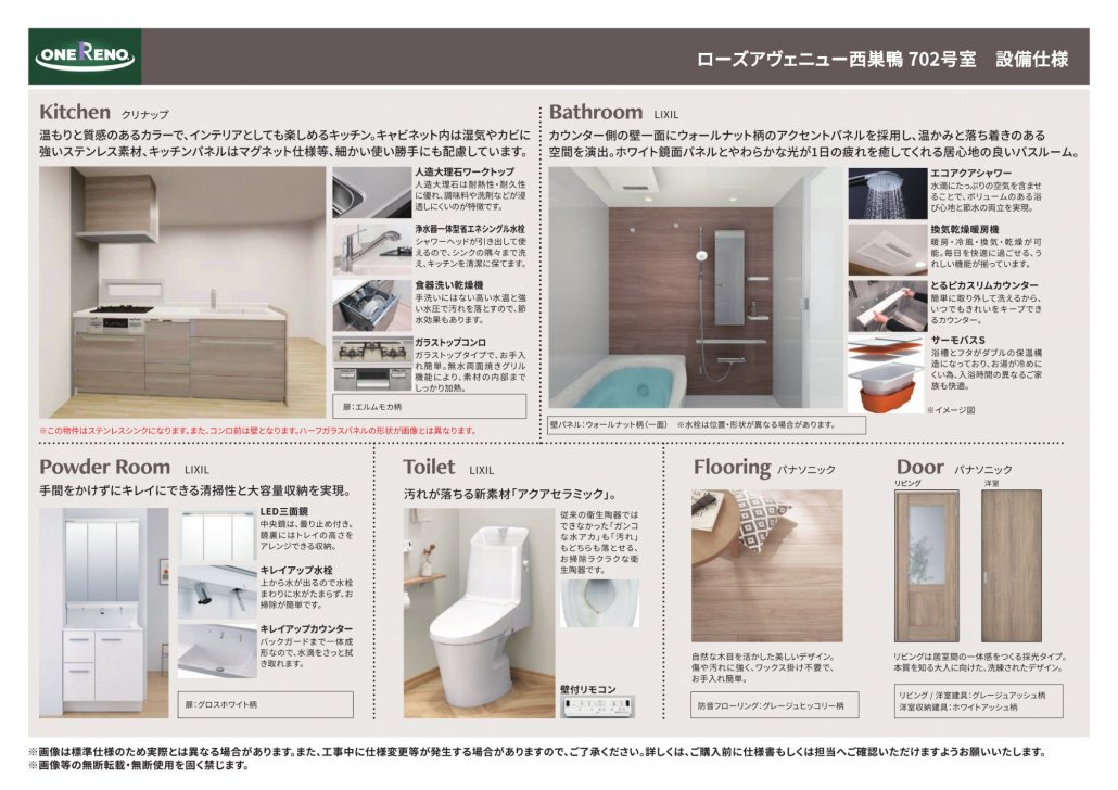 | 設備 | キッチン交換/浴室交換/洗面交換/トイレ交換/ 水まわり床張替/フローリング新規(張替)/建具交換/ 照明交換/給湯器(追焚機能)交換/下足入/全クロス貼替/ アクセントクロス | ||